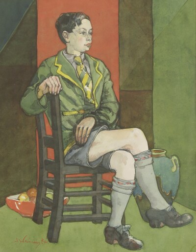 PORTRAIT OF A BOY, FULL LENGTH SEATED, WEARING SCHOOL UNIFORM