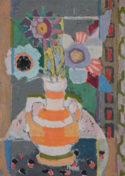 Vase mit Blumen, Rechteck auf rundem Tisch