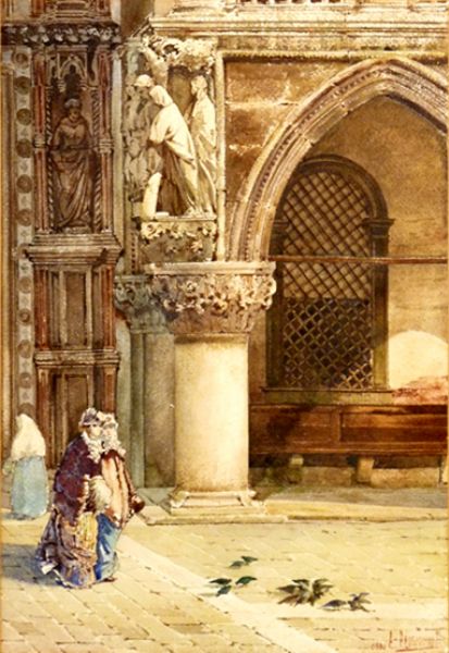 | TWO LADIES BESIDE A CHURCH ENTRANCE, WITH PIGEONS FEEDING IN THE FOREGROUND, POSSIBLY PIAZZA SAN MARCO, VENICE | |