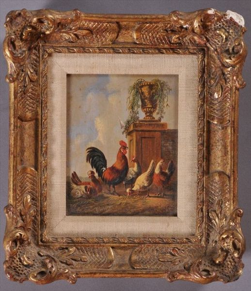 COCKS, HENS AND STONE URN IN A LANDSCAPE