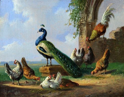 Een pauw, een haan en kippen bij een ruïne in een zonnig landschap.