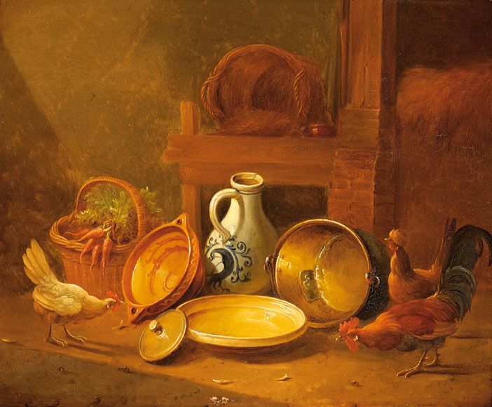 | Two cocks and a chicken by a brass pot, stoneware and a basket with carrots in a barn interior | |