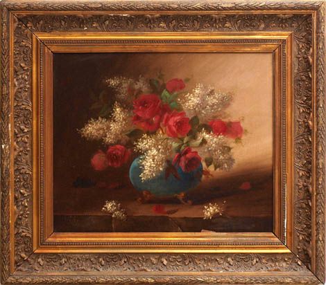 Magnificent bouquet of lilacs in a magnificent vase of red roses on a table