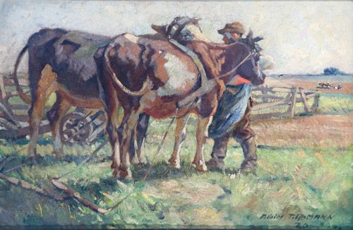 Bauer mit Kühen, im Hintergrund Blick in weitere Landschaft