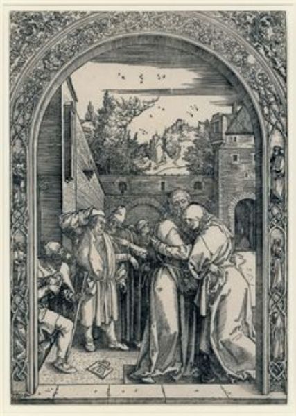 | Joachim and Saint Anna meet at the Golden Gate, plate 4 from: The Life of the Virgin (Bartsch 79; Hollstein, Meder 191) | |