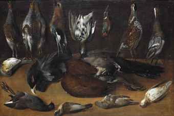| Partridges, an eurasian jay, a quail, a kingfisher and a duck, all suspended from nails, a capercaillie and various other birds | |
