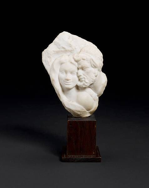 A carved white marble group of a satyr and young female