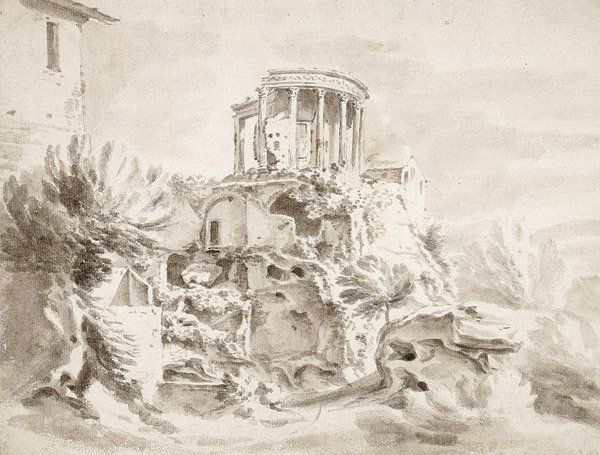 | Der Tempel der Vesta in Tivoli. Pinselzeichnung in Braungrau über schwarzer Kreide | |