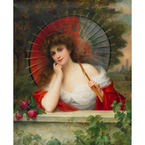 BEAUTY WITH PARASOL AT A GARDEN WALL