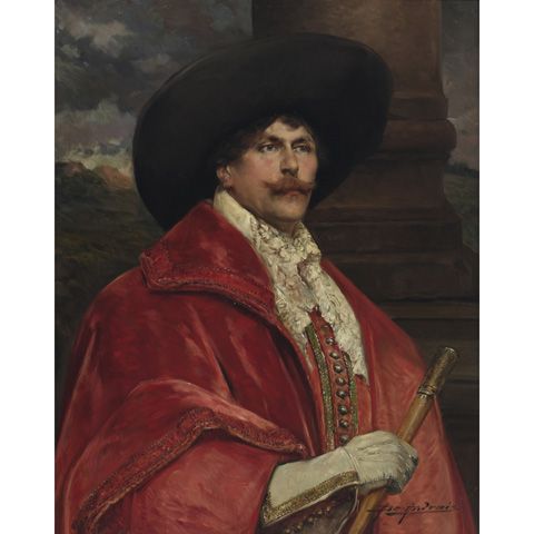 CAVALIER IN RED POISED IN A LANDSCAPE