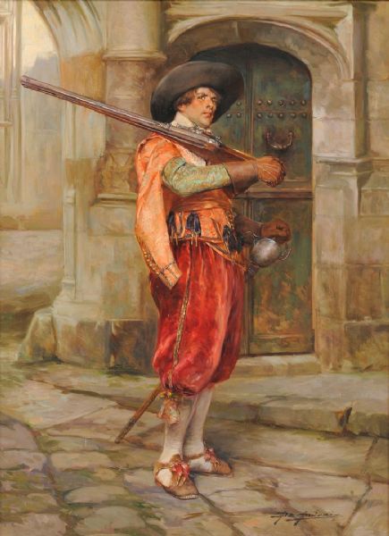 | Soldier standing beside a doorway, wearing 17th/18th century costume, holding a gun across his right shoulder | |