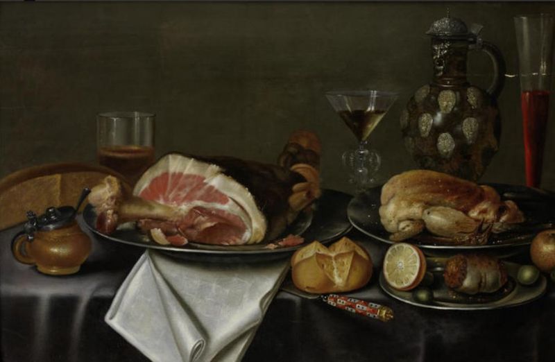 | A still life with a ham and chicken on silver plates, glasses of wine and beer, a bread roll, a peeled lemon and an earthenware | |