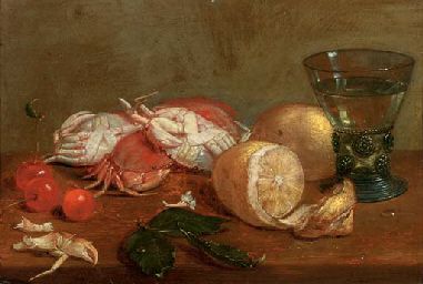 | A 'roemer' of white wine, crabs, cherries and lemons on a wooden ledge | |