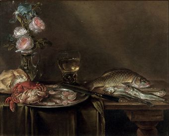 | Roses and an iris in a glass vase, crabs and prawns on a pewter platter, a bread roll, a 'Roemer' and fish, all on a partly drap | |