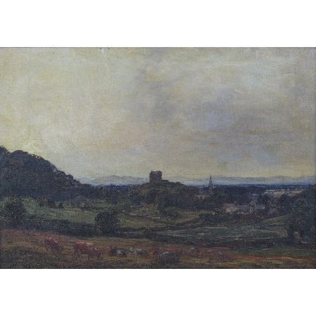 | Scottish landscape scene with cattle grazing in the foreground, a ruined castle on a hill above a town in the distance | |