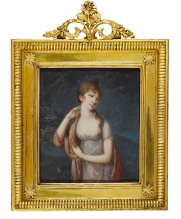 | Watercolor and bodycolour on ivory, ormolu frame with floral surmount | |