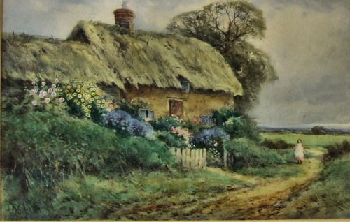 | Thatched cottage with old English garden and figure on track to foreground | |