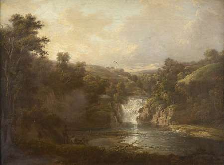 A WOODED RIVER LANDSCAPE WITH FIGURES BY A WATERFALL