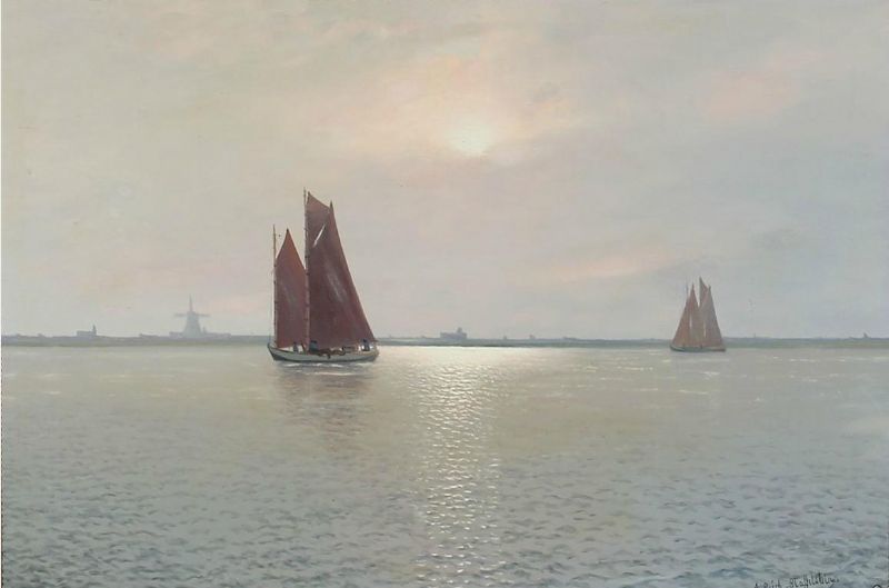 | Evening atmosphere with fishing boats at sea off a coast | |