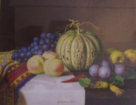| Still life of fruit on a ledge including melon, peaches, plums, grapes etc. | |