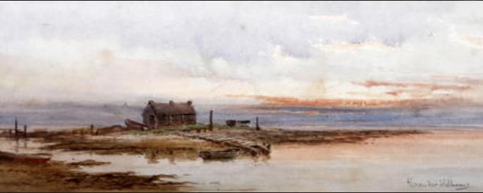 Coastal scene, low tide with boat house