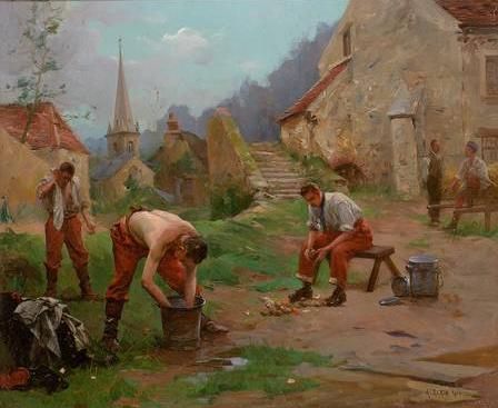Rekruten beim Waschen und Gemüse putzen am Morgen