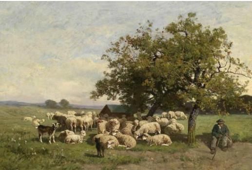 Flock of Sheep and Shepherd in an Open Landscape in Summer