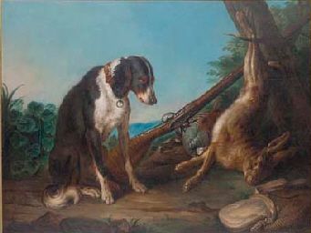 | A dead hare and game birds in a clearing with a rifle and a dog | |