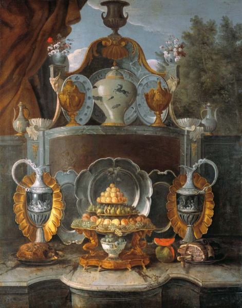 STILLEBEN MIT PRÉSENTOIRS UND FRÜCHTEN