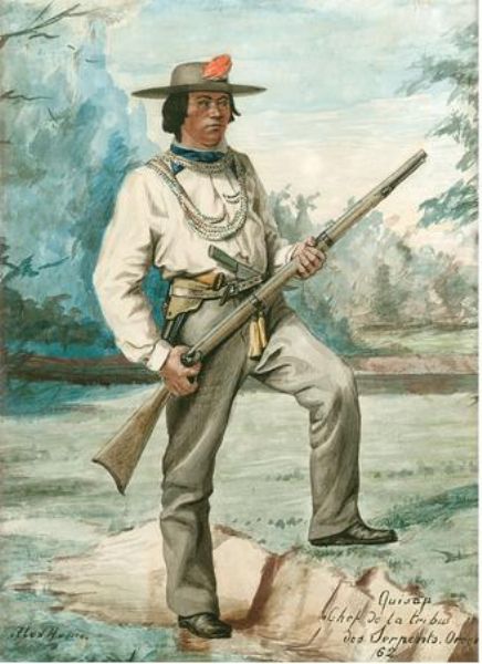 | Chief de la Tribu des Serpents Oregon tenant un fusil dans un paysage | |