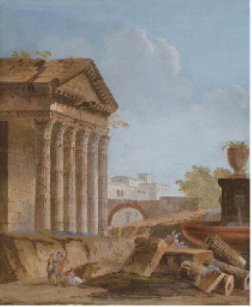 | Caprice architectural avec un temple, une fontaine, quelques ruines et des maisons à l'arrière-plan | |