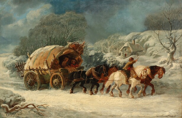 A horse-drawn carriage making its way through a snow-covered landscape