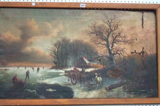 | Figures and a log cart at a frozen lake at dusk | |