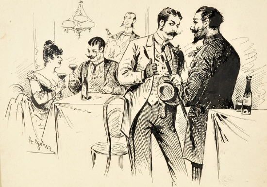 Im Gasthaus: Vorne zwei Herren, hinter ihnen ein Wein trinkendes Paar