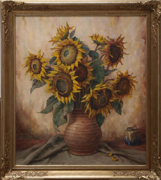 Sonnenblumenstrauß in brauner Tonvase auf gefälteltem Tuch vor changierendem Hintergrund.