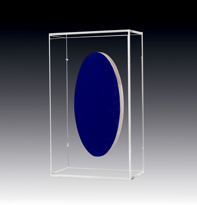 pigmento su pietra arenaria ovale, colore blu 23050 29,5x12,5x3 cm, firma, anno e n° di archivio al retro, dichiarazione d'autenticità dell'artista con archivio su foglio A4 allegato, entro teca in plexiglass.