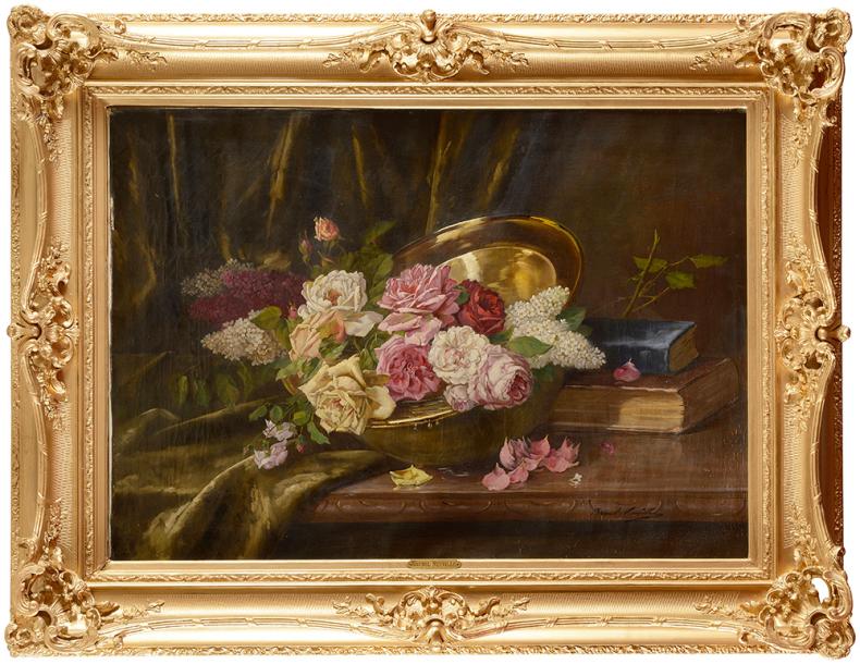 | Roses et lilas dans un bassin doré | |