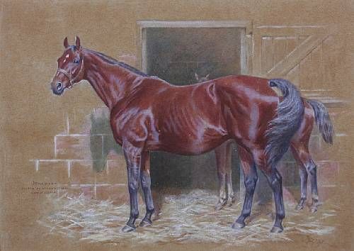 | A thoroughbred mare, 'Ornament, sister to Ormonde and dam of Sceptre', with foal behind | |