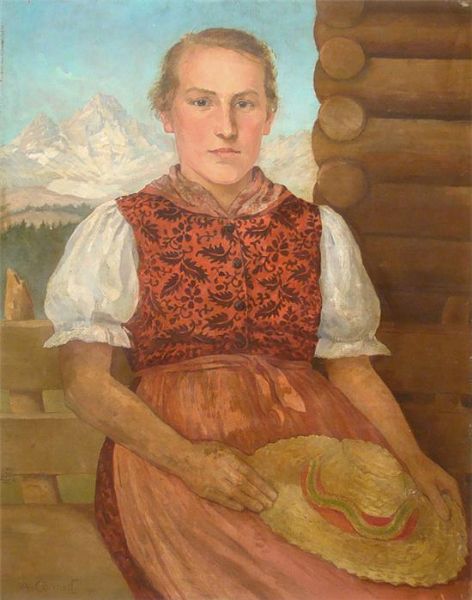 Vor Almhütte sitzende Bäuerin, im Hintergrund Felsmassiv