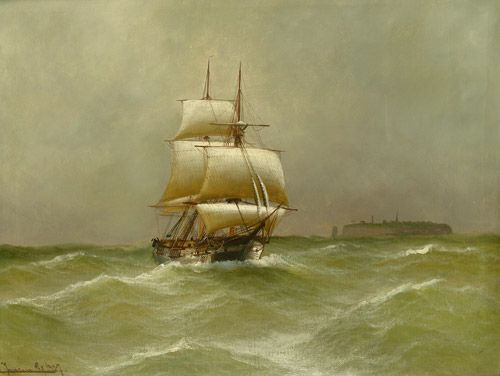 Dreimaster in stürmischer See bei Helgoland