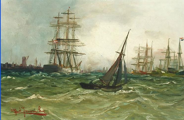 Seascape with numerous sailing ships outside a port.
