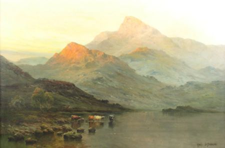 A HIGHLAND LOCH WITH CATTLE AND MOUNTAINS BEYOND