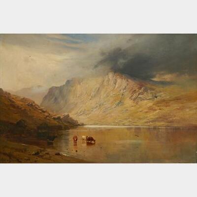 Alfred de Breanski Sr. (British 1852-1928)- Highland Cattle in Mountain Stream- oil on canvas, signed Alfred de Breanski lower left, 1 paint flake in sky. 20 x 30'' | |