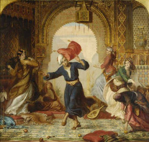 | Scene from the Arabian Nights, four girls throwing cushions and fruit at a young boy | |