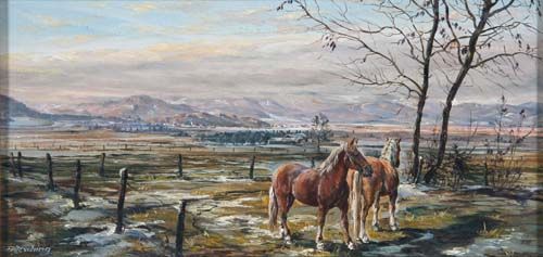 Pferdepaar auf winterlicher Weide in Voralpenlandschaft