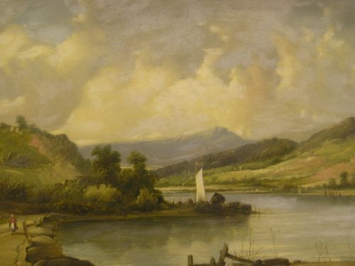| A mountain landscape with a lake, a moored sailing boat and figures on a track | |
