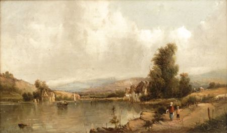 A RIVER VIEW WITH FIGURES IN THE FOREGROUND