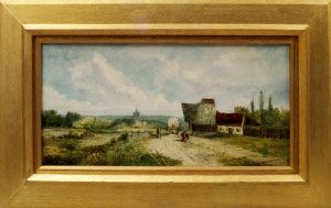 Gypsy caravan on a country lane by a farm house with church in the distance