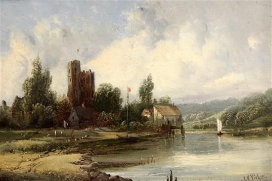 River landscape with cottages beside a castle