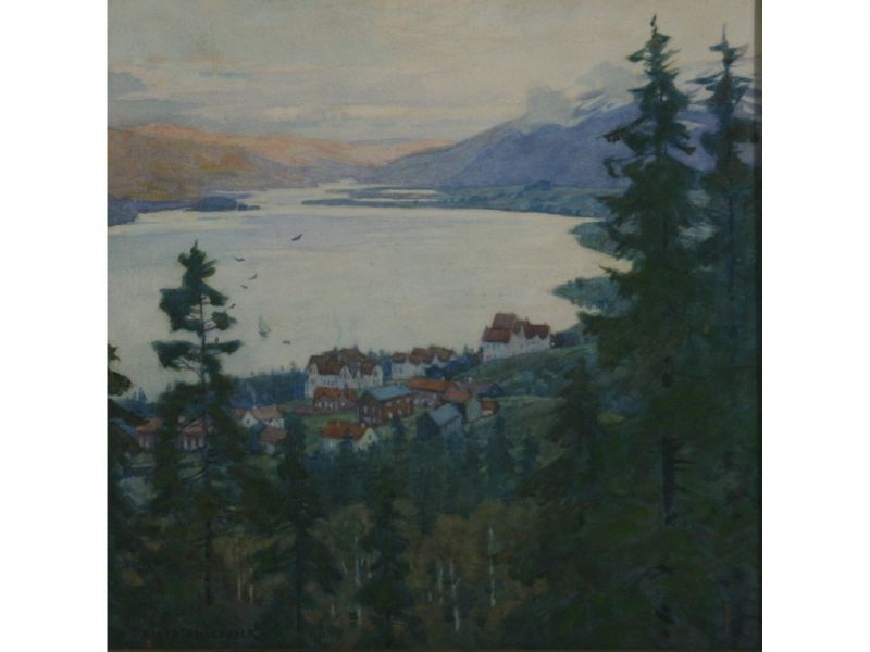 | view of a Scandinavian town from an elevated position, with large Fjord and mountains beyond | |